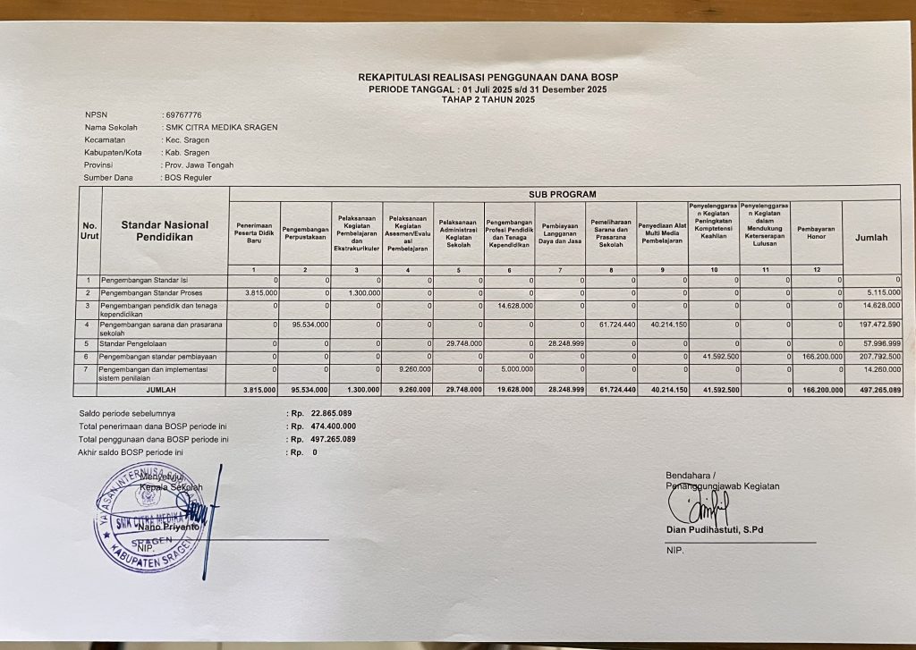 Updated on 6 January 20266 January 2026/ admin REKAPITULASI REALISASI PENGGUNAAN DANA BOSP PERIODE TANGGAL : 1 JULI 2025 sd 31 DESEMBER 2025 TAHAP 2 TAHUN 2025Tak Berkategori